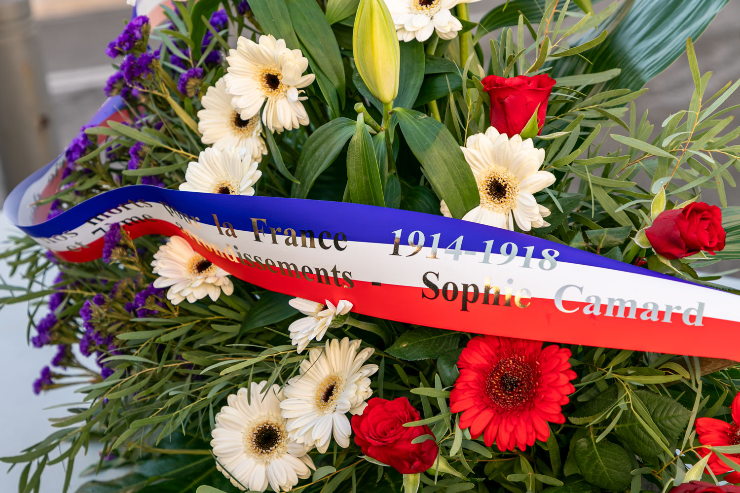 10h05 : diffusion de la Marseillaise, dépôt de gerbes par Mme la Maire, les représentants de l'Etat, de la Région, du Département et de la commune, sonnerie aux morts, minute de silence.