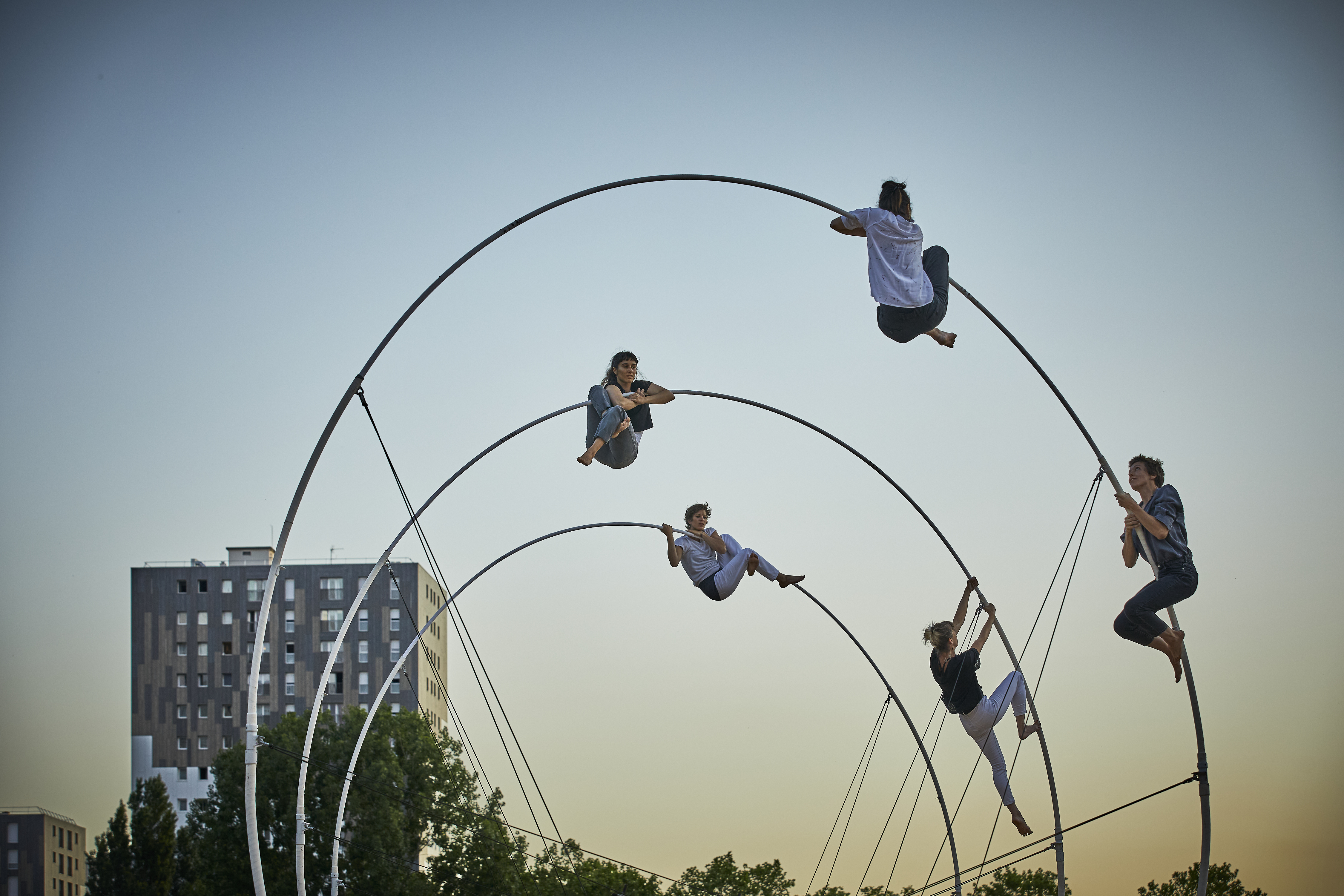 Sur une structure monumentale, une spirale haute de six mètres, formée de trois immenses boucles en filin d’acier, cinq suspensives s’élancent dans les airs. S’amusant avec la lenteur et le vide, elles nous offrent ainsi un numéro entre le jeu d’équilibristes et le ballet aérien. Un numéro surprenant par la légèreté qu’il dégage et la force nécessaire pour l’exécuter.