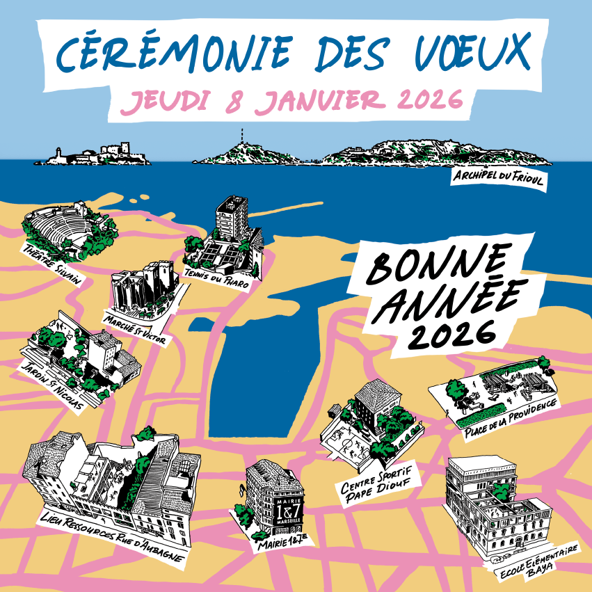 Toute l'équipe de la Mairie des 1er et 7e arrondissements a le plaisir de vous convier à la cérémonie des vœux le jeudi 8 janvier 2026 au Palais du Pharo afin de partager ensemble un moment d’échange et de convivialité !