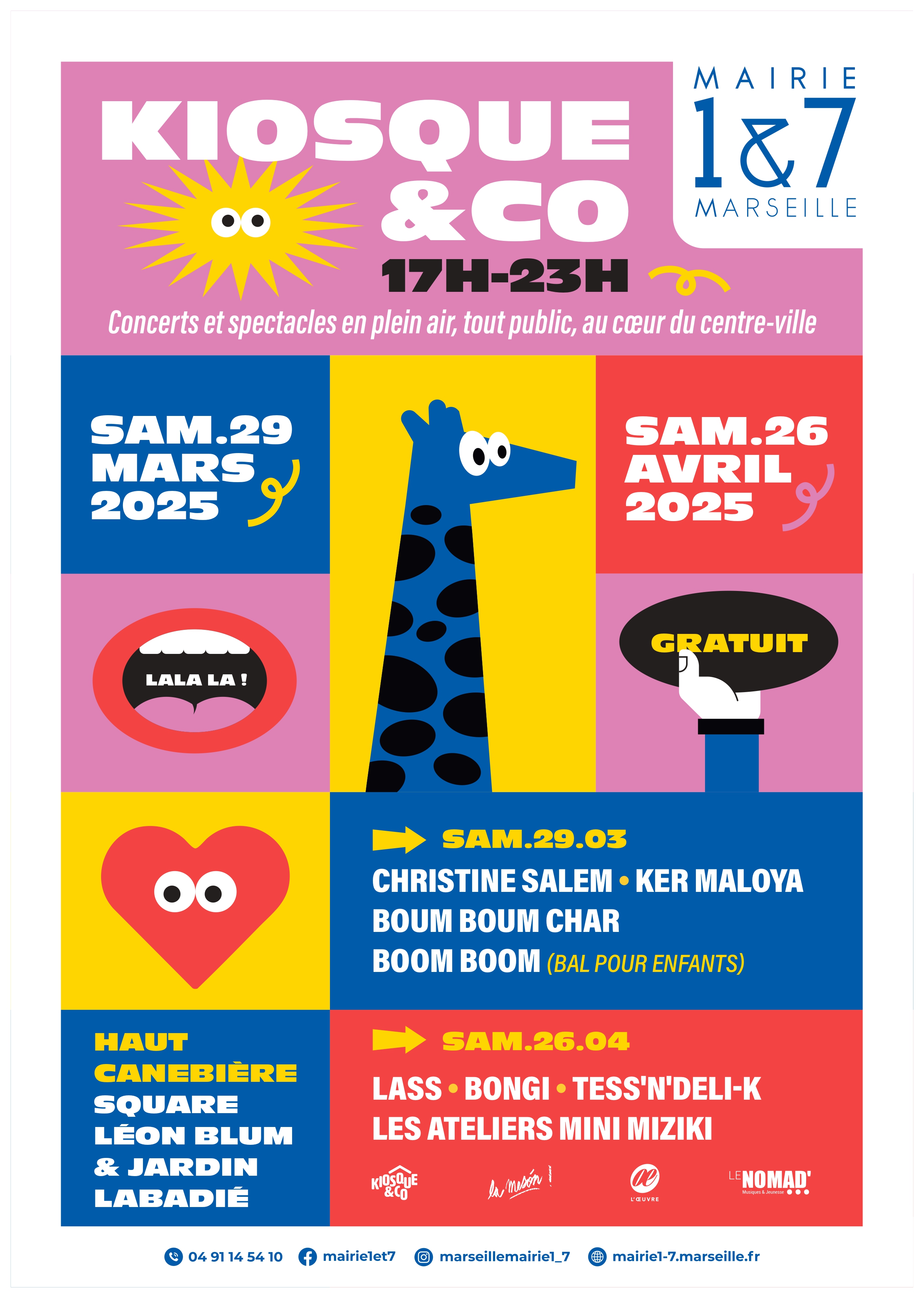 La Mairie 1-7 fête l'arrivée du printemps avec cette nouvelle édition de concerts gratuits au kiosque à musique du haut-Canebière. La Méson et le Théâtre de l'Oeuvre ont programmé de belles surprises sous la supervision de Zarafa, la girafe lettrée !